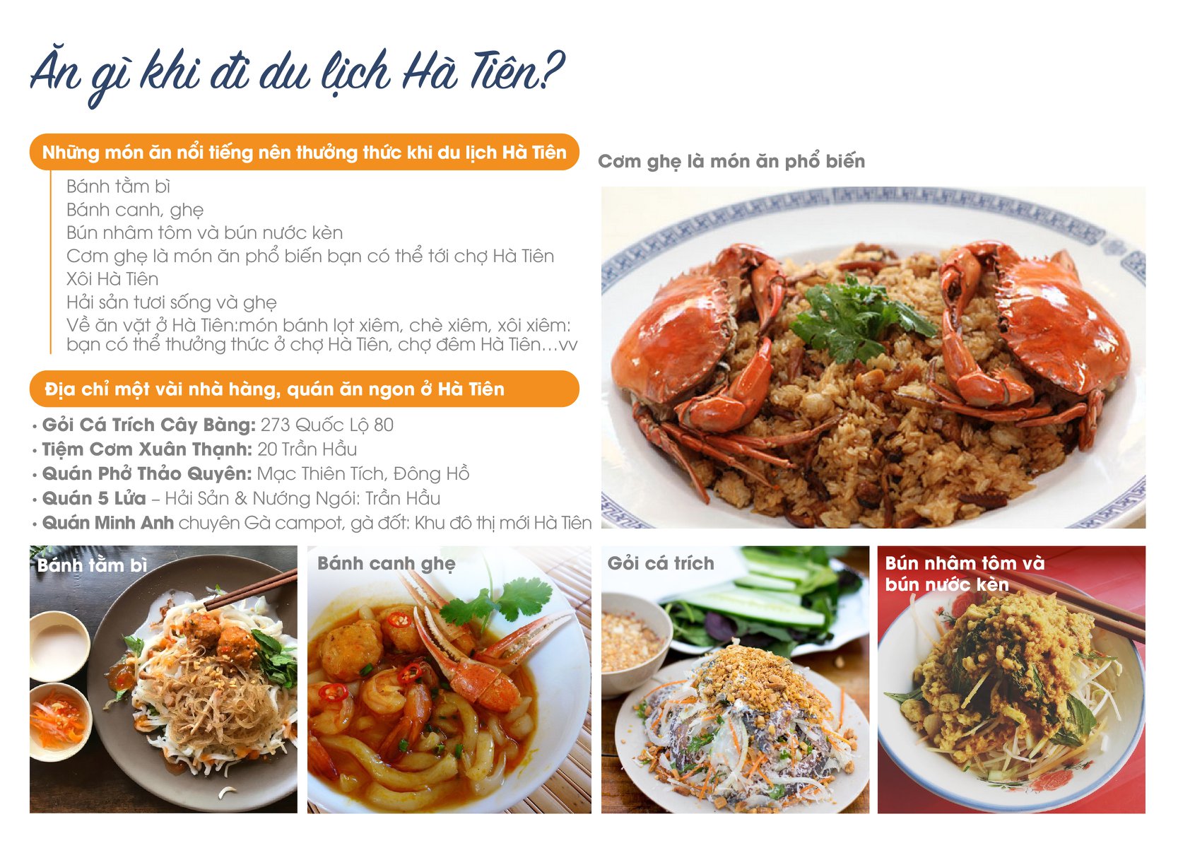 Kết thúc một ngày dài khám phá, buổi tối là lúc để thưởng thức ẩm thực đa dạng của Hà Tiên. Du khách có thể lựa chọn các món ăn no như cơm tấm, hủ tiếu hấp, nem nướng, gà đốt, gỏi cá trích. Nếu muốn ăn nhẹ, hãy thử bánh tằm bì, các loại nộm, bánh canh ghẹ, chả cá, bánh lọt xào hay xôi Hà Tiên. Các khu vực ăn uống sôi động như Mũi Nai hoặc gần chợ trung tâm thành phố, trên các tuyến đường Mạc Thiên Tích, Phương Thành sẽ là lựa chọn lý tưởng.